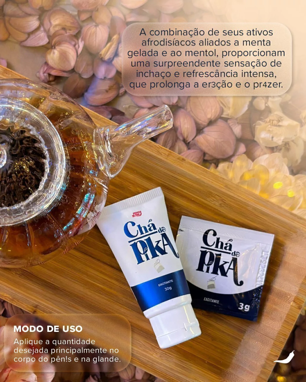 O Gel Chá de Pika excita, lubrifica, refresca e prolonga a ereção é ideal para ser usado no sexo oral, possui sabor marcante de Menta e Catuaba além de conter particulas de glitter.